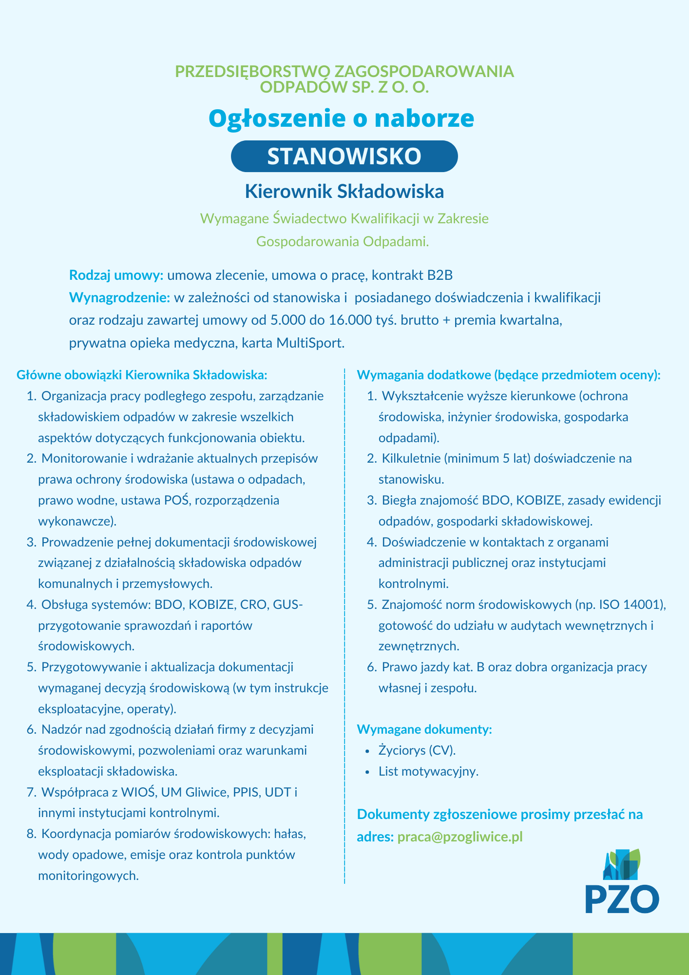 OFERTA PRACY – KIEROWNIK SKŁADOWISKA POWRÓT DO AKTUALNOŚCI POZOSTAŁE AKTUALNOŚCI ZMIANA CENNIKA ODPADÓW – OD 1 STYCZNIA 2026 Monika Niemczyk2025-12-24T14:49:55+01:0024 grudnia, 2025|POWRÓT DO AKTUALNOŚCI SPRAWDŹ NOWY CENNIK [...] PZO W CZASIE OKOŁOŚWIĄTECZNYM Monika Niemczyk2025-12-24T14:44:02+01:0024 grudnia, 2025|POWRÓT DO AKTUALNOŚCI [...] PZO W CZASIE OKOŁOŚWIĄTECZNYM Monika Niemczyk2025-12-18T13:14:15+01:0018 grudnia, 2025|POWRÓT DO AKTUALNOŚCI [...] KOMUNIKAT PZO Monika Niemczyk2025-12-15T15:34:12+01:0015 grudnia, 2025|POWRÓT DO AKTUALNOŚCI [...] 12Kolejny Monika Niemczyk2025-07-29T14:06:10+02:00