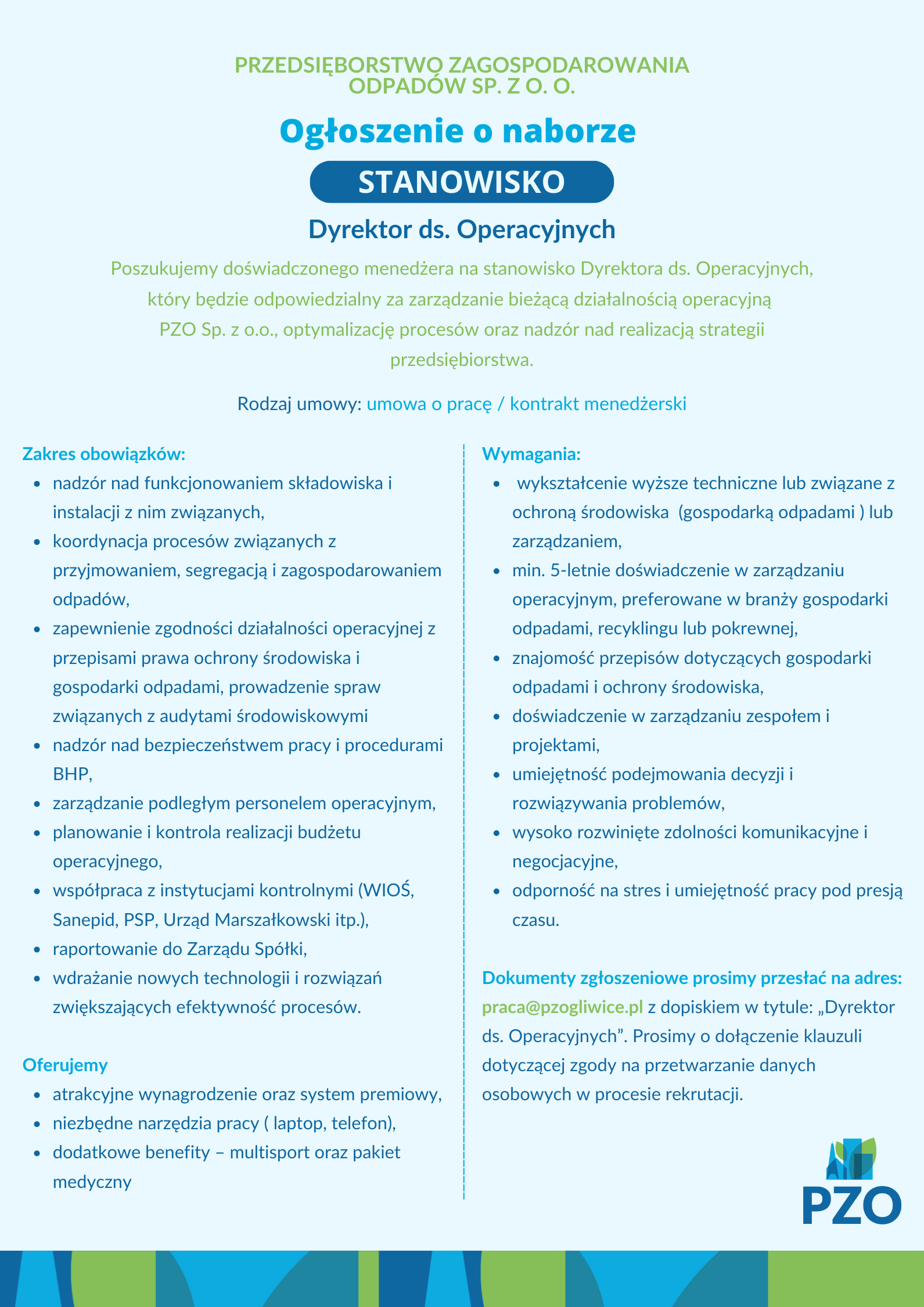 ZATRUDNIMY DYREKTORA ds. OPERACYJNYCH POWRÓT DO AKTUALNOŚCIOgłaszamy nabór na stanowisko: Dyrektor ds. Operacyjnych Być może to Ciebie szukamy – wyślij swoje zgłoszenie.POZOSTAŁE AKTUALNOŚCI ZMIANA CENNIKA ODPADÓW – OD 1 STYCZNIA 2026 Monika Niemczyk2025-12-24T14:49:55+01:0024 grudnia, 2025|POWRÓT DO AKTUALNOŚCI SPRAWDŹ NOWY CENNIK [...] PZO W CZASIE OKOŁOŚWIĄTECZNYM Monika Niemczyk2025-12-24T14:44:02+01:0024 grudnia, 2025|POWRÓT DO AKTUALNOŚCI [...] PZO W CZASIE OKOŁOŚWIĄTECZNYM Monika Niemczyk2025-12-18T13:14:15+01:0018 grudnia, 2025|POWRÓT DO AKTUALNOŚCI [...] KOMUNIKAT PZO Monika Niemczyk2025-12-15T15:34:12+01:0015 grudnia, 2025|POWRÓT DO AKTUALNOŚCI [...] 12Kolejny Monika Niemczyk2025-09-25T09:53:49+02:00
